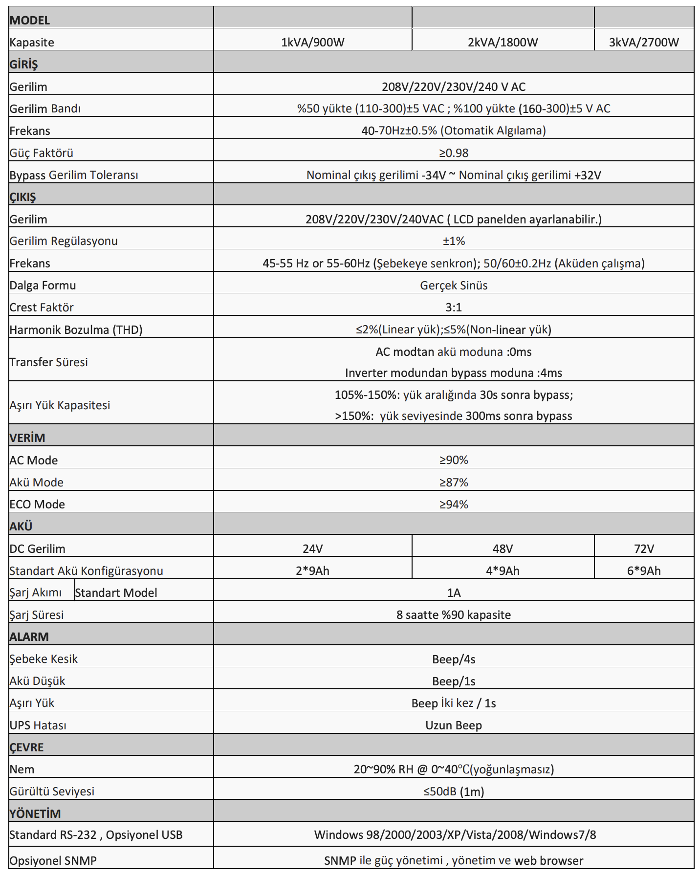 • RS-232 seri port ile haberleşme ve RJ45 koruması (USB ve SNMP opsiyonel)